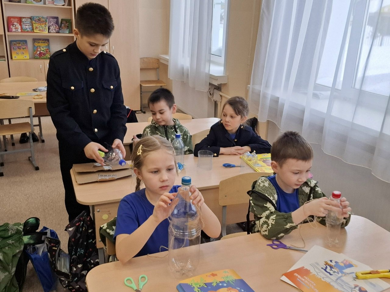 В лицее продолжает работать система вожатства "ОТ ИСКРЫ ДО МАЯКА".💥 Ученики 5ГС класса сегодня показали один из вариантов и помогли изготовить кормушки для птиц нашим первокласникам 1ГС класса.