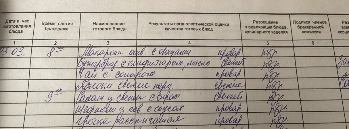 Наличие записей в бракеражном журнале готовых блюд 03.03.2025 Прикрепления: