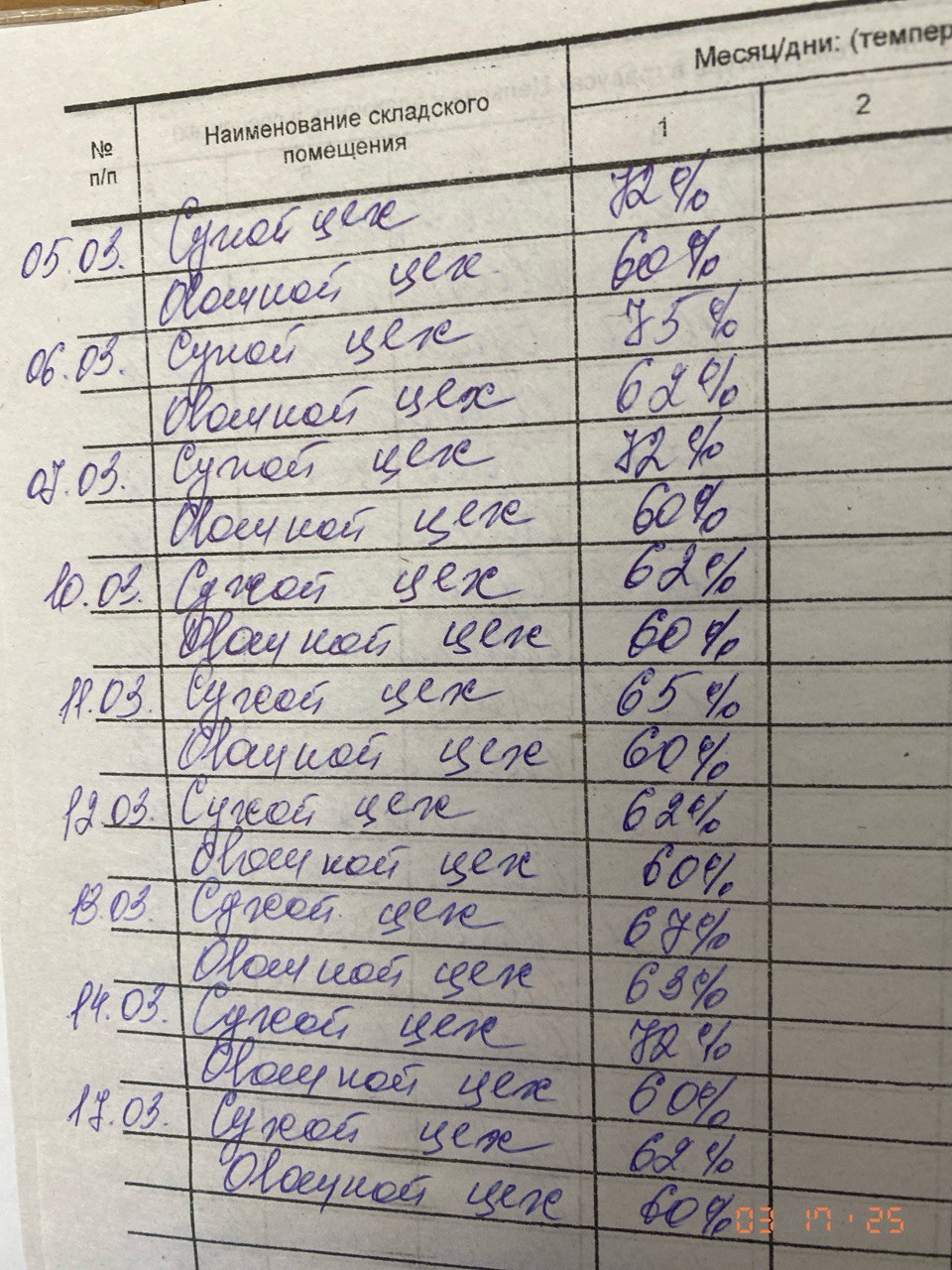 Журнал учета температуры и влажности в складских помещениях за 17 марта