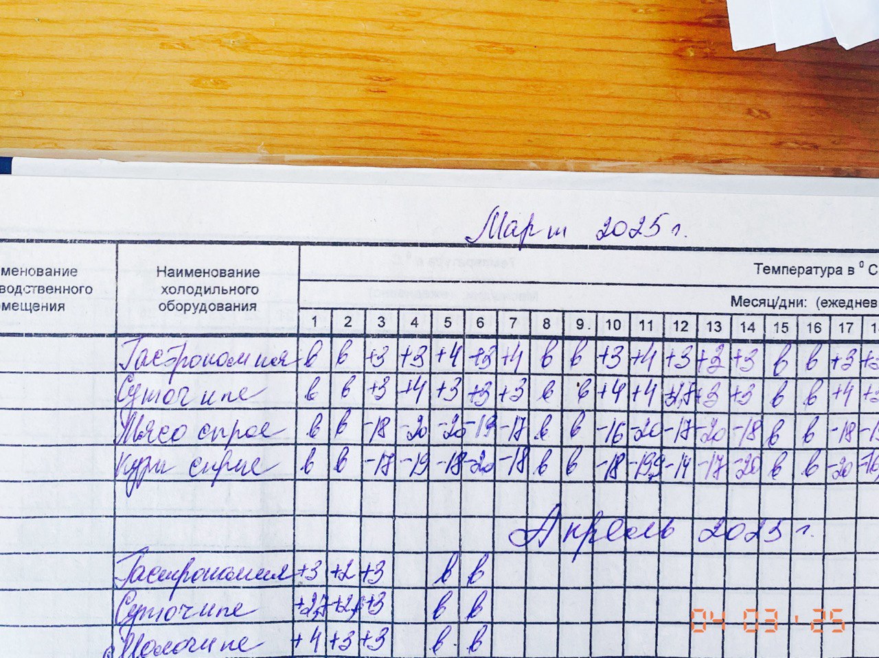 Журнал учета температурного режима холодильного оборудования за 3 апреля