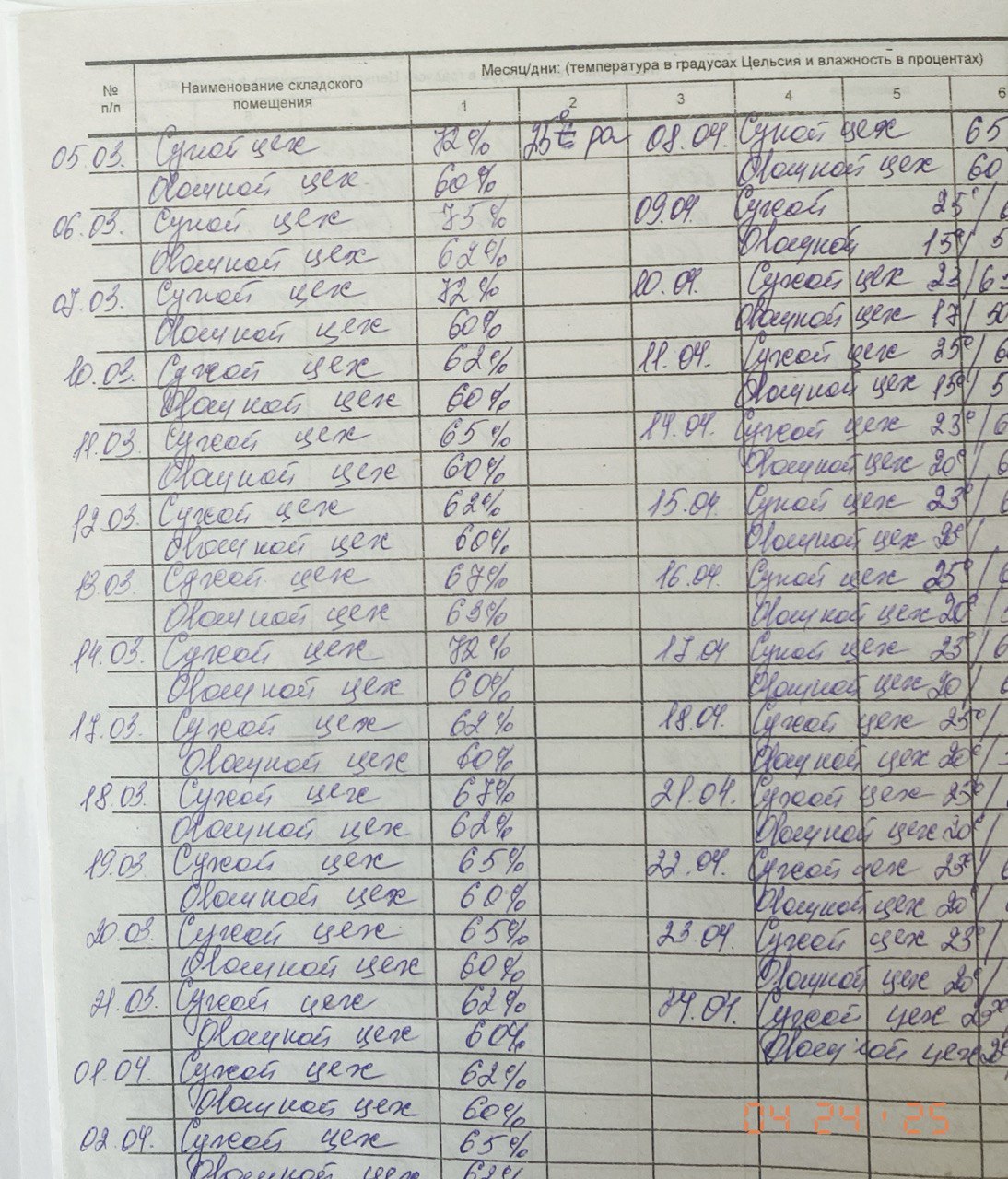 Журнал учета температуры и влажности в складских помещениях за 24 апреля