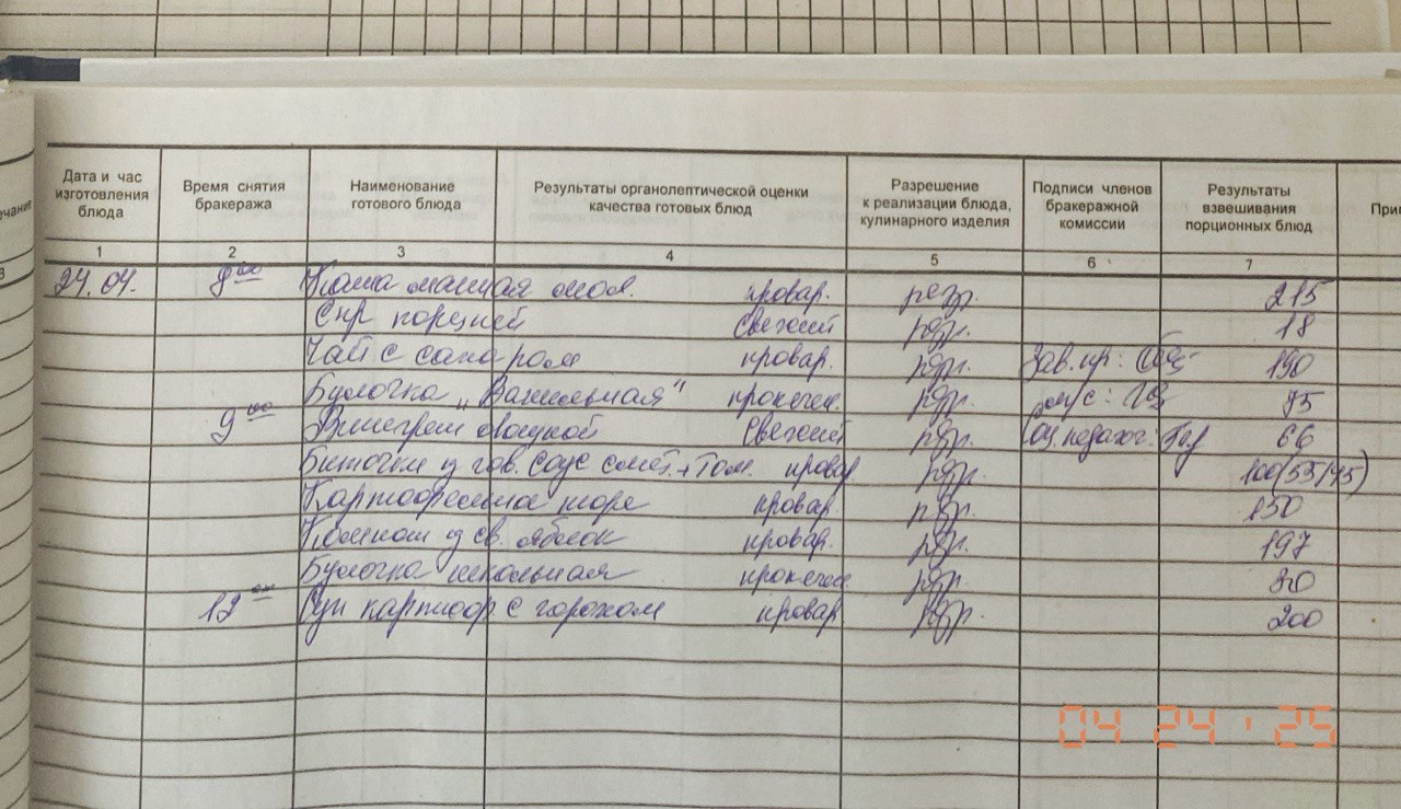 Бракеражный журнал 24.04.2025