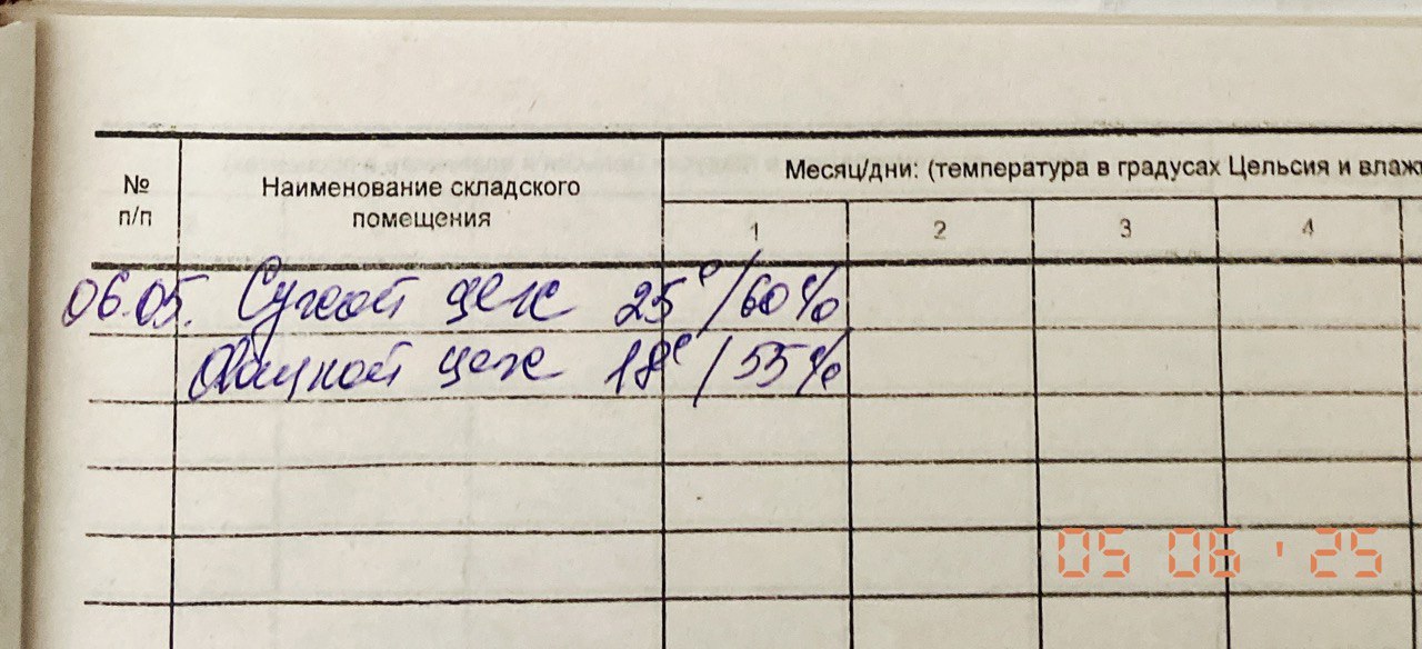 Журнал учета температуры и влажности в складских помещениях за 6 мая