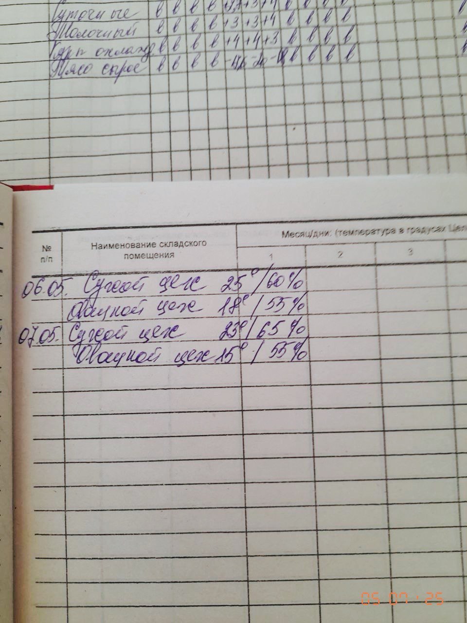 Журнал учета температуры и влажности в складских помещениях за 7 мая