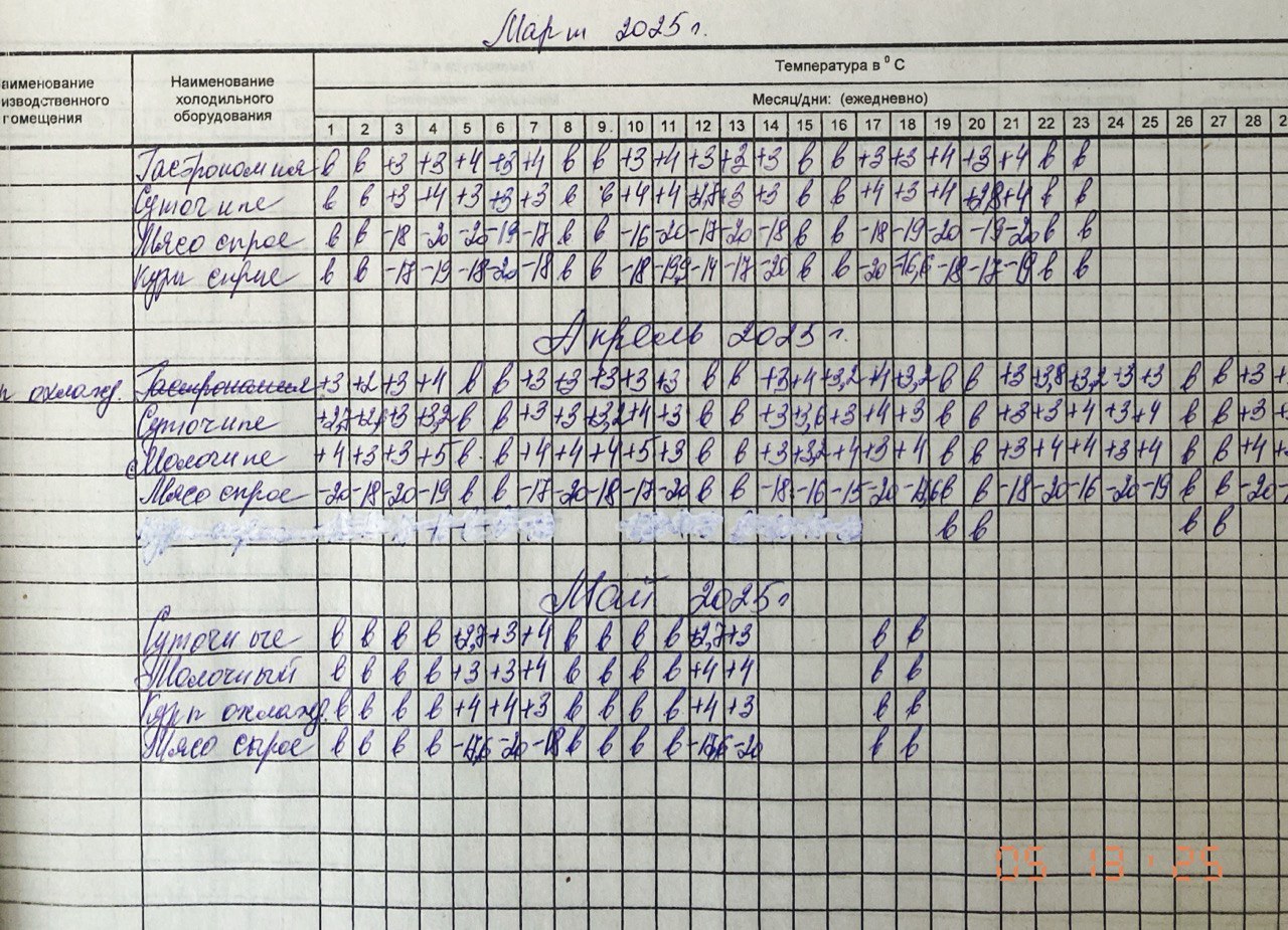 ![]() Журнал учета температурного режима холодильного оборудования за 13 мая | |