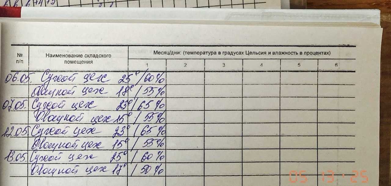 09:31 Журнал учета температуры и влажности в складских помещениях за 13 мая | |